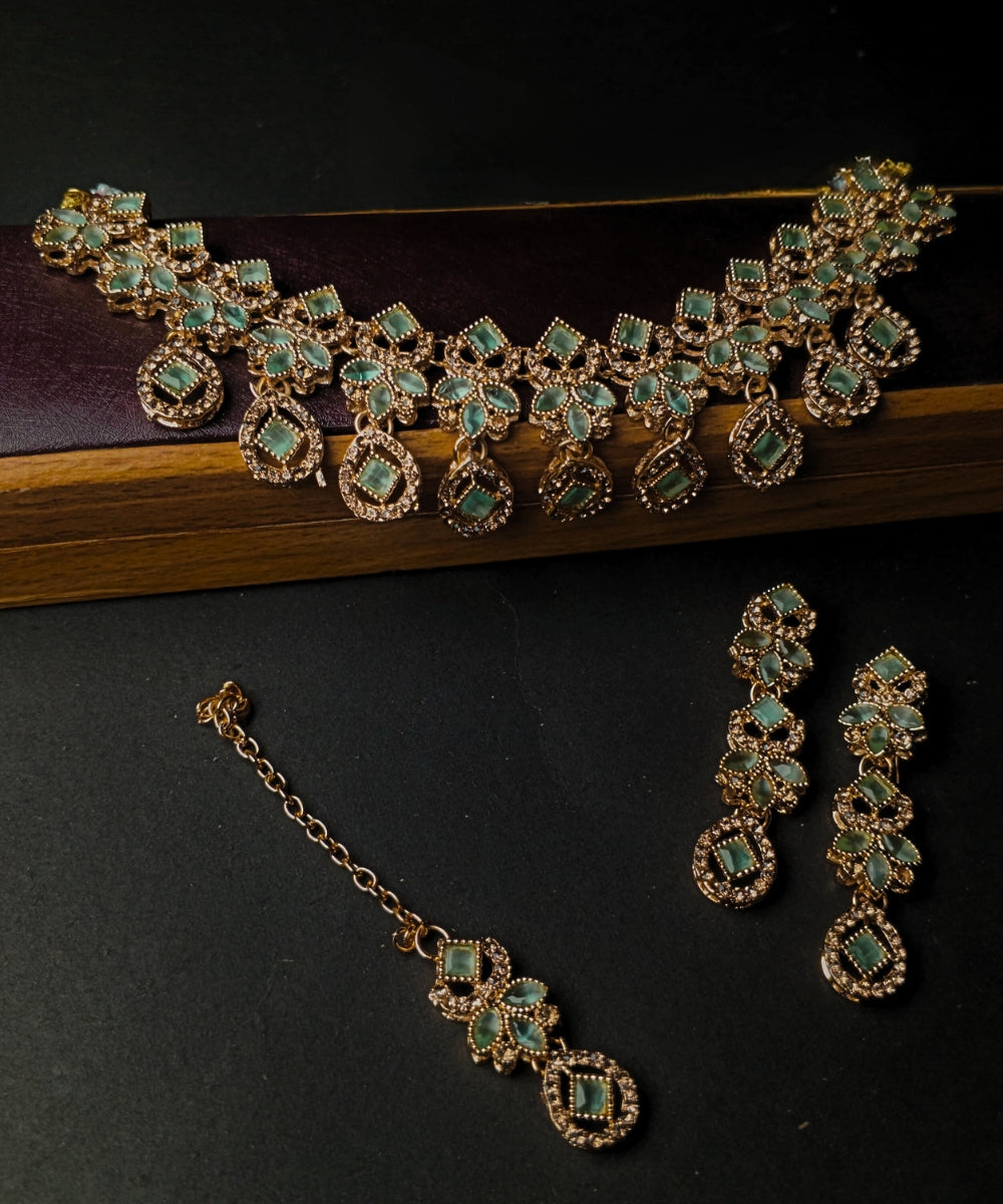 Regular price $29.00 CADSale price $29.00 CAD Regular priceUnit price / perThis jewelry set exudes sophistication and elegance with its intricate design and vibrant green stones. The set comprises a statement necklace, matching earrings, and a tikka,...